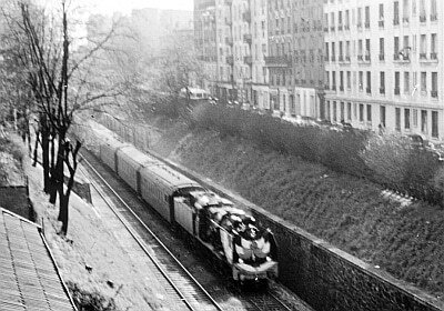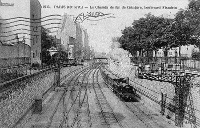 - Un train de la Compagnie des Chemins de fer de l’Ouest, parti de la gare de Paris-Saint-Lazare, se dirige vers la gare du Champ de Mars via le raccordement de Boulainvilliers, mis en service en 1900.