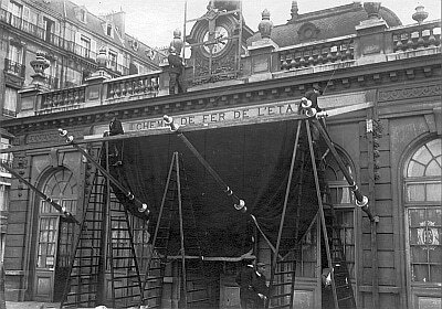- Des ouvriers sont en train de pavoiser la façade du bâtiment des voyageurs. Sur la fronton, la mention du Chemin de fer de l’État signifie que la visite a lieu après 1908.